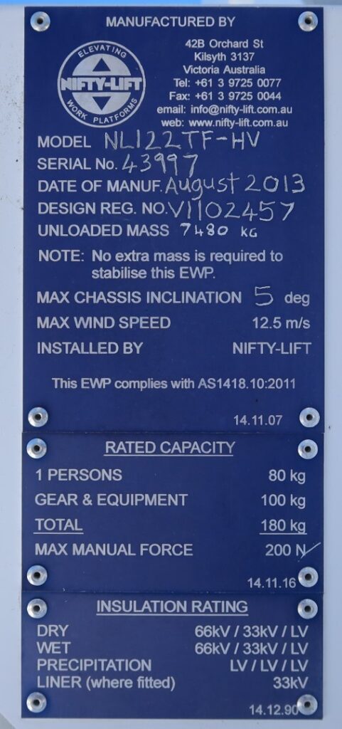 Fitted with a 2013 Nifty-Lift NL122TF-HV Elevating Work Platform (EWP / Cherry Picker) inc;