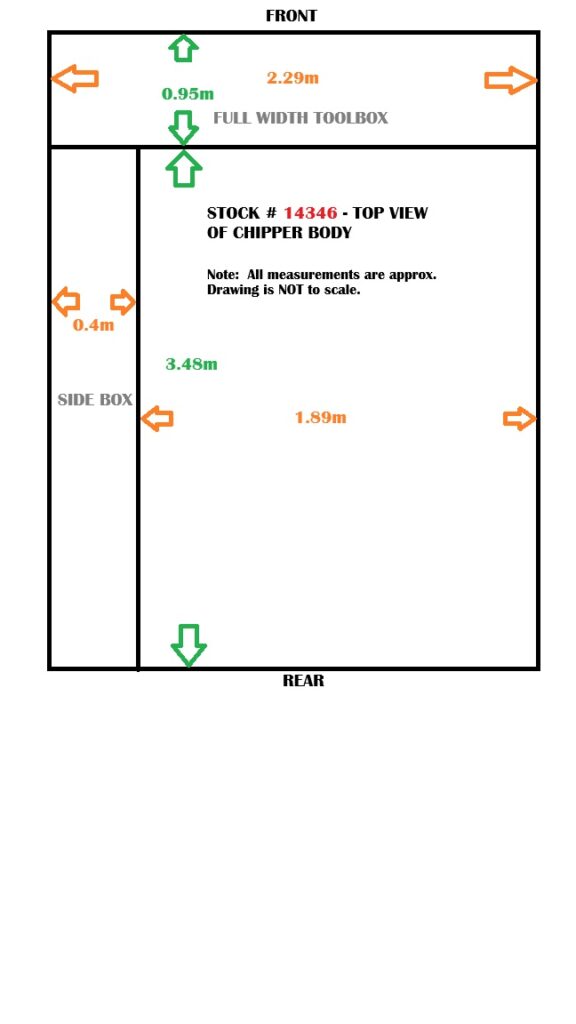 Fitted with a Gibson Tru-Body steel TIPPER CHIPPER BIN body (Internally approx 4.43m L x 2.29m W x 1.75m H – all measurements are taken from the internal extremities – see diagram of top view for full measurements) inc;
