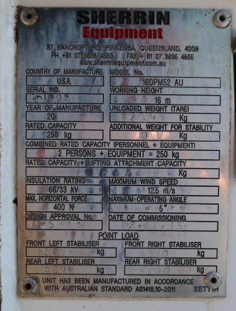 Fitted with a *REMOTE CONTROL* Sherrin 16DPM52 AU Elevating Work Platform (EWP / Cherry Picker) – Commissioned 3.3.2015 inc;